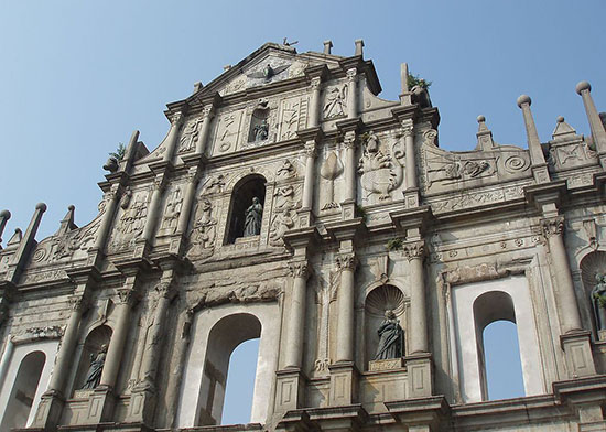 大三巴牌坊是澳門代表性的名勝古跡,為1580年竣工的圣保祿大教堂的前壁,此教堂糅合了歐洲文藝復(fù)興時(shí)期與東方建筑的風(fēng)格而成,體現(xiàn)出東西藝術(shù)的交融。